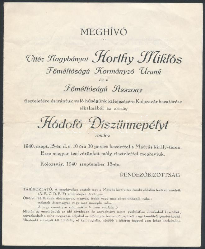 1940 Kolozsvár, meghívó a bevonulási ceremóniára és az esemény program... https://www.darabanth.com/en/278-Online-auction/278.0/Other-collectibles/Historical-documents-manuscripts~38/1940-Kolozsvar-meghivo-a-bevonulasi-ceremoniara-es-az-esemeny-programja-terkepes-segedl~II1431019
