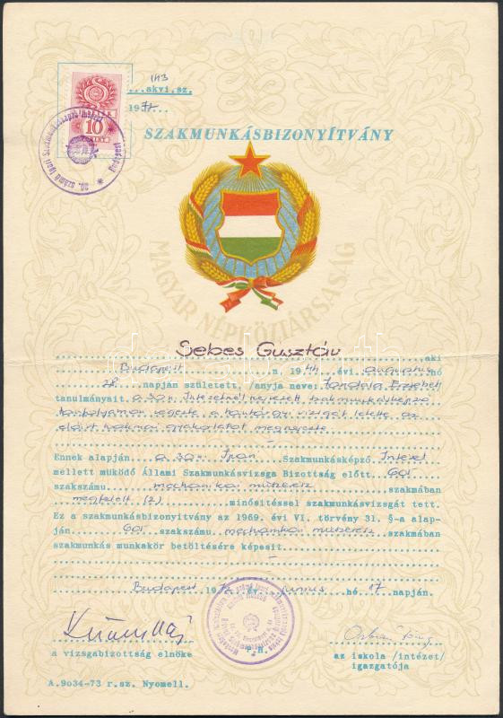 1972 Sebes Gusztáv (a legendás labdarúgó edző fia) szakmunkás bizonyítványa