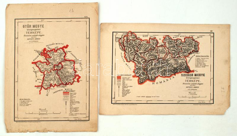 Description: 1880 Győr és Szeben megye közigazgatási térképe. Hátsek Ignác - A magyar szent korona országainak megyei térképei. Rajzolta Hátsek Ignácz. Budapest, 1880. Rautmann Frigyes Kiadó Hivatala Posner Károly Lajos. Határszínezett kőnyomat, hibával a széleken, 2db, 38x27cm