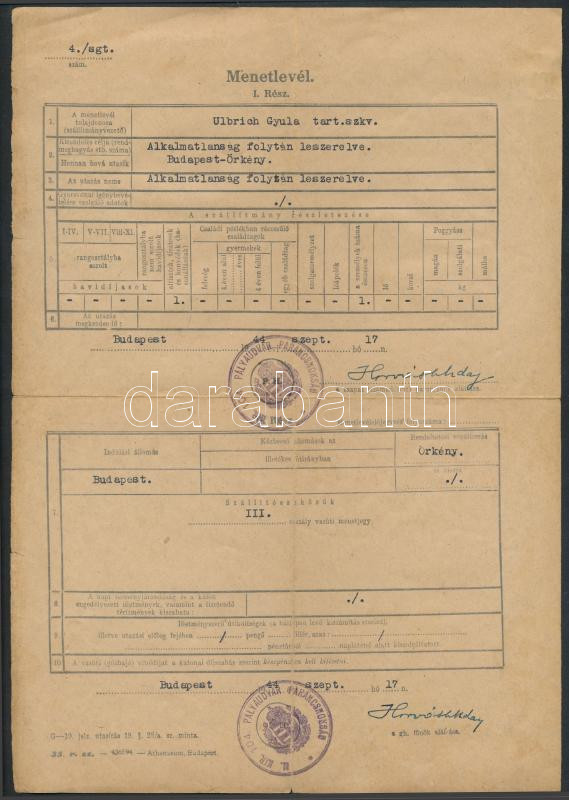 https://www.darabanth.com/en/278-Online-auction/278.0/Other-collectibles/Military~2/1944-Bp-Alkalmatlansag-miatt-leszerelt-katona-szamara-kiallitott-menetlevel~II1427578
