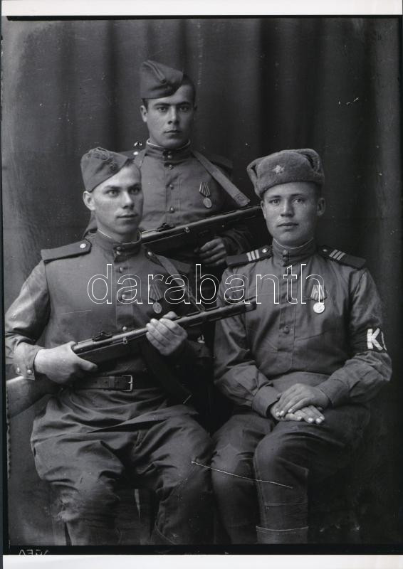 cca 1944 Kecskemét, a Vörös Hadsereg három katonája Lőcsei Árpád műtermében, a szerző hagyatékában őrzött negatívról készült mai nagyítás, 25x18 cm