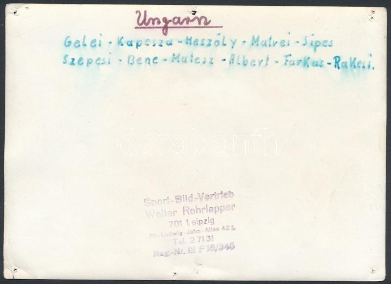 Description: 1966 VII. 23. A magyar labdarúgó válogatott (Mészöly, Albert) a Szovjetunió elleni mérkőzés előtt. Hátoldalon feliratozott fotó, a Sport-Bild-Vertrieb Walter Rohrlapper pecsétjével, tűnyomokkal, 13×18 cm