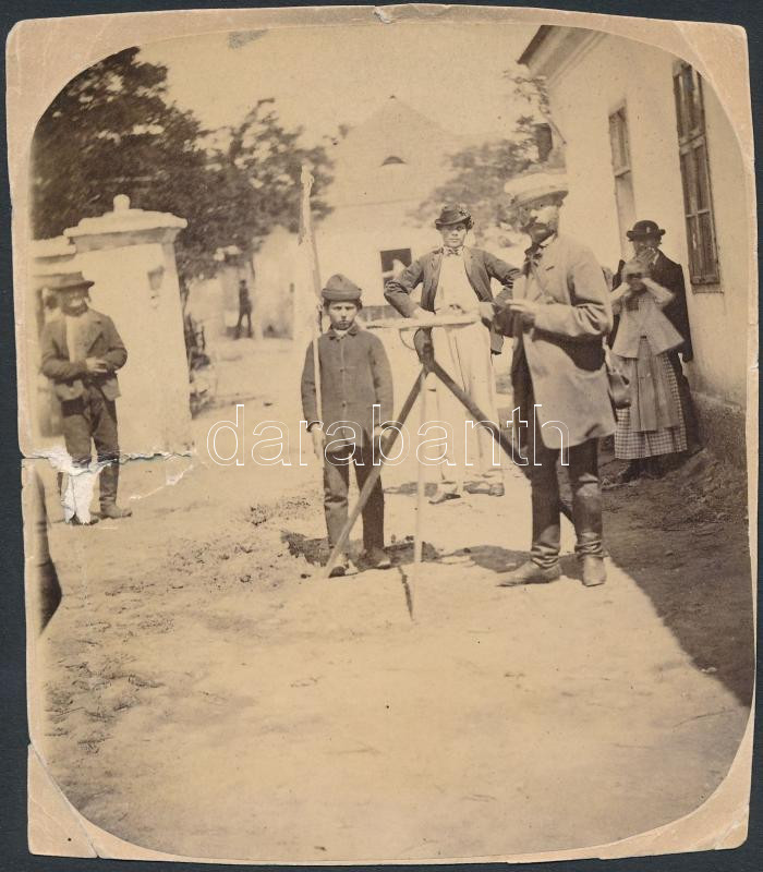 báró Wittinghoff Evald királyi földmérő (1826-1882) fényképe munka közben Pécsen, szakadásokkal 12x13 cm