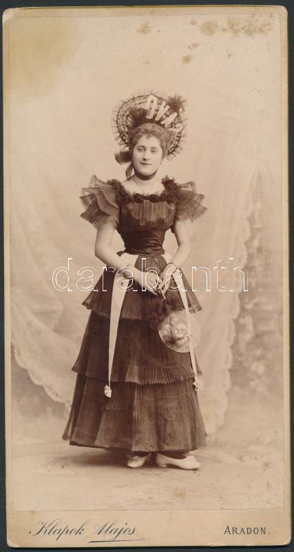 cca 1900 Fiatal hölgy ünnepi öltözetben, egyedi kalapban. Keményhátú fotó Klapok Alajos aradi műterméből, 21×11 cm