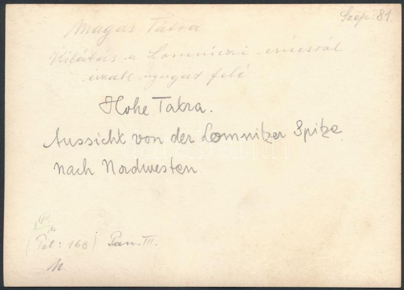 Description: cca 1910-1915 Magas-Tátra, kilátás a lomnici csúcsról, Erdélyi Mór felvétele, hátoldalon feliratozva, 11x16 cm / High Tatras, vintage photo, with description on the verso, 11x16 cm
