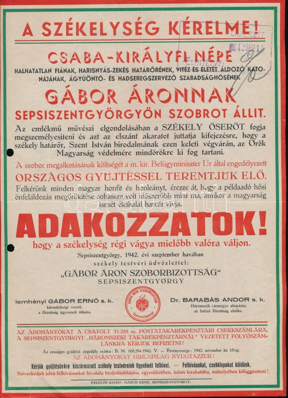 1942 Adakozzatok! A székelység kérelme! plakát. Rajta érkeztető és eli...
