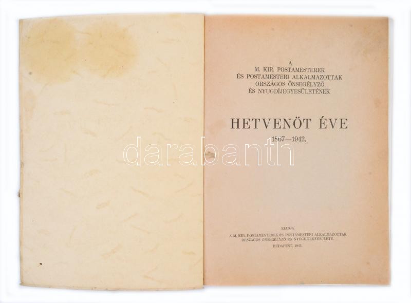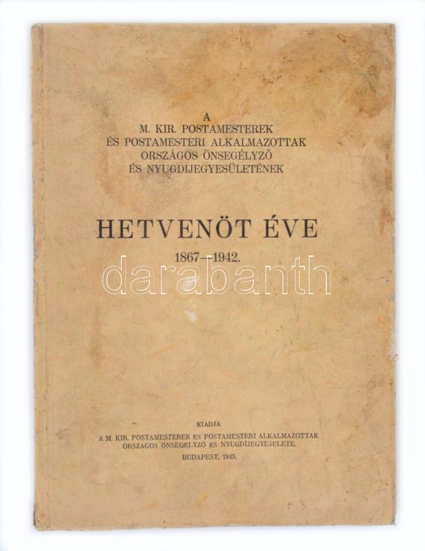 Description: 1943 A Magyar Királyi Postamesterek és Postamesteri Alkalmazottak Országos Önsegélyező és Nyugdíjegyesületének hetvenöt éve 1867-1942. Budapest, 1943, Magyar Királyi Postamesterek és Postamesteri Alkalmazottak Országos Önsegélyező és Nyugdíjegyesülete. Kiadói papírkötés, fekete-fehér fotókkal, a postamesterek fotóival, leírásokkal. A borítója foltos, a kötése laza, a hátsó előzéklap szakadt.