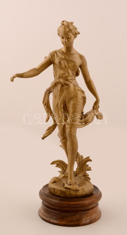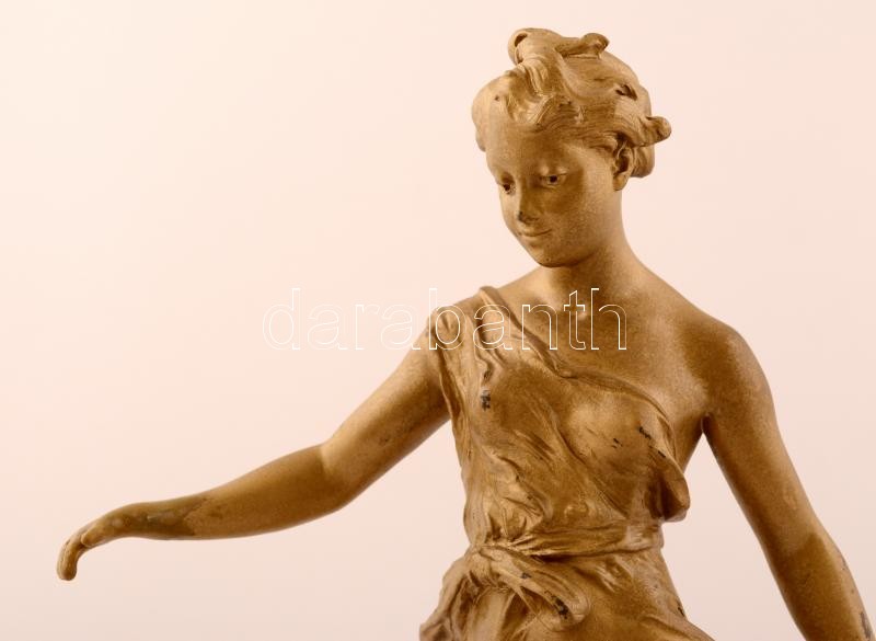 Ernest Justin Ferrnard után: Lány a köveken. Festett spiáter, jelzett, utánöntés, javított, fa talapzaton m: 38 cm