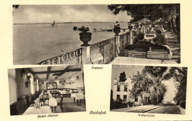 Budapest XXII. Budafok, terasz, belső étterem, Kutyavilla, hátoldalon ...
