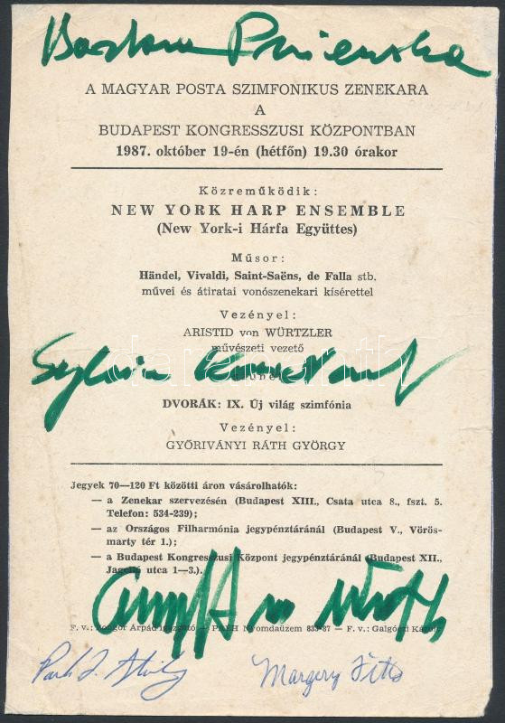 1987 Würtzler Arisztid (1925-1997), felesége, Barbara Pniewska (?-?) hárfaművészek és mások aláírásai budapesti fellépésük programján