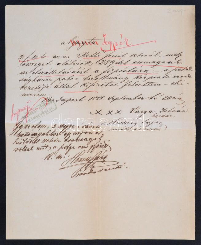1884 Hordár magyar nyelvű elismervénye a szabadságharc szoborbizottságával kapcsolatos csomagok átvételéről