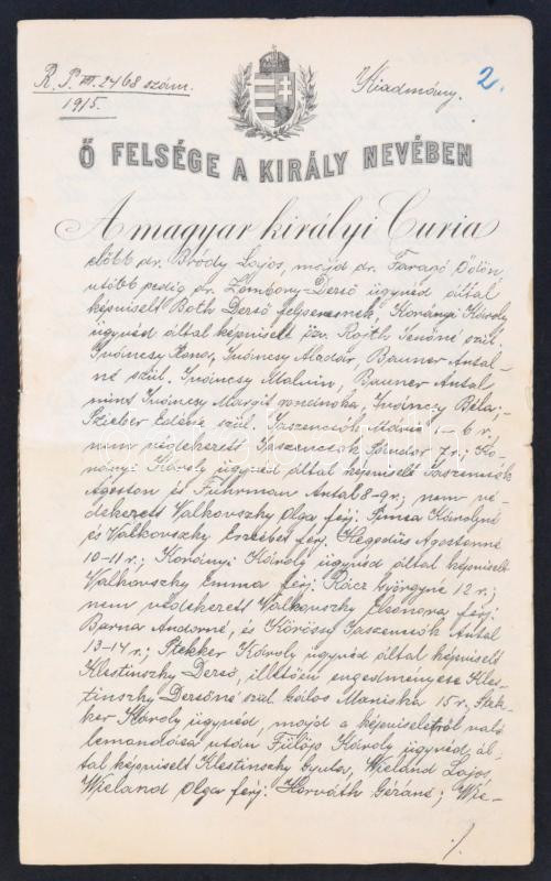 1915 Magyar királyi kúriai ítélet peres ügyben, kiadmány, szárazpecséttel, 8 p.