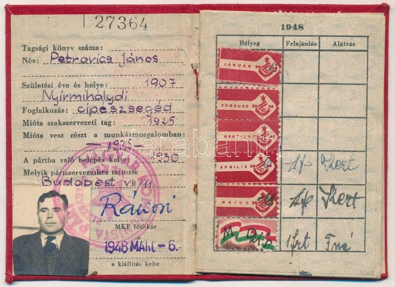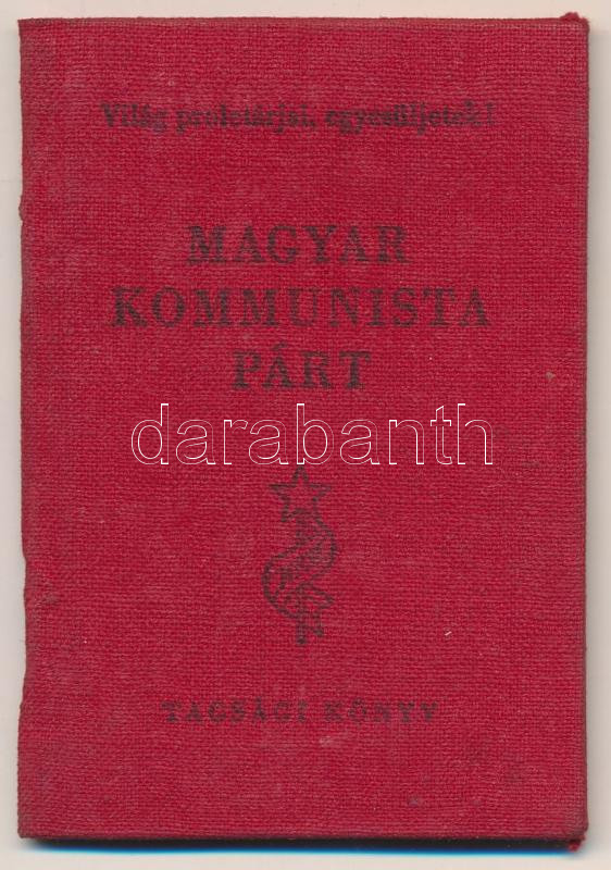 https://www.darabanth.com/en/279-Online-auction/279.0/Other-collectibles/Documents~16/1948-Tagsagi-konyv-Magyar-Kommunista-Part-sok-belyeggel-nyomtatott-Rakosi-alairassal-10x~II1434294