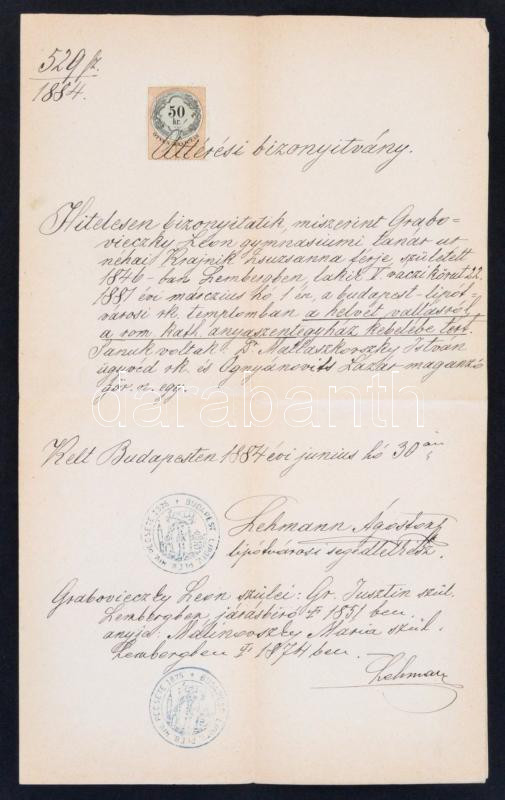 1884 Grabowieczky Leon (1881-1968) játéktervező apjának az áttérési bizonyítványa, pecséttel, okmánybélyeggel, aláírással, középen hajtással, jó állapotban.