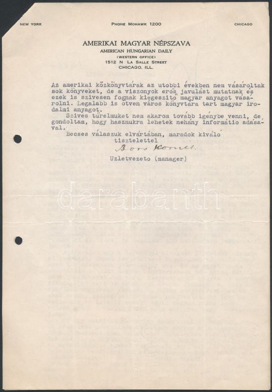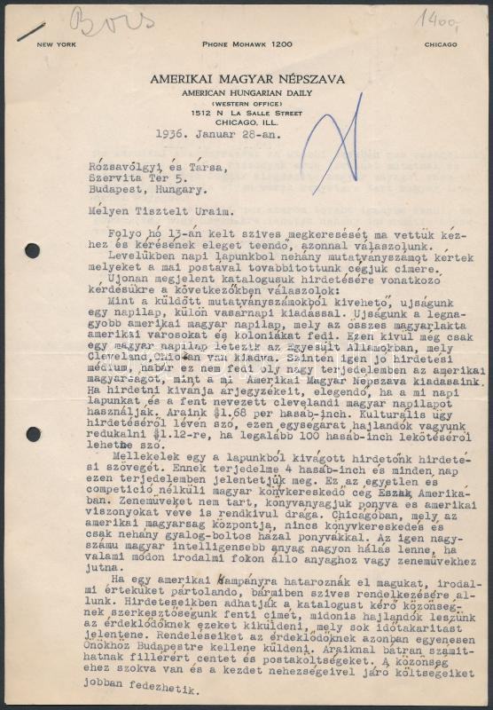 1936 Bors Kornél (?-?) az Amerikai Népszava üzletvezetőjének gépelt, kézzel aláírt levele a Rózsavölgyi és Társa kiadónak terjesztéssel kapcsolatos ügyekben