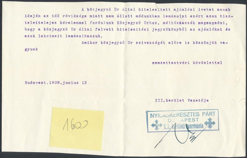 1939 A Nyilaskeresztes Párt budapesti XII. kerületi szervezetének kérvénye összegyűjtött ajánlóik névsorának és lakcímeik kiadására