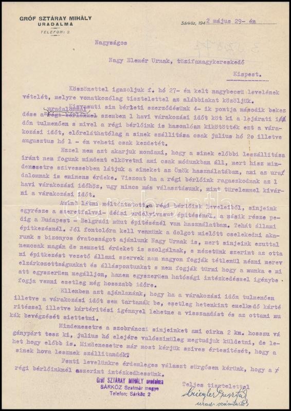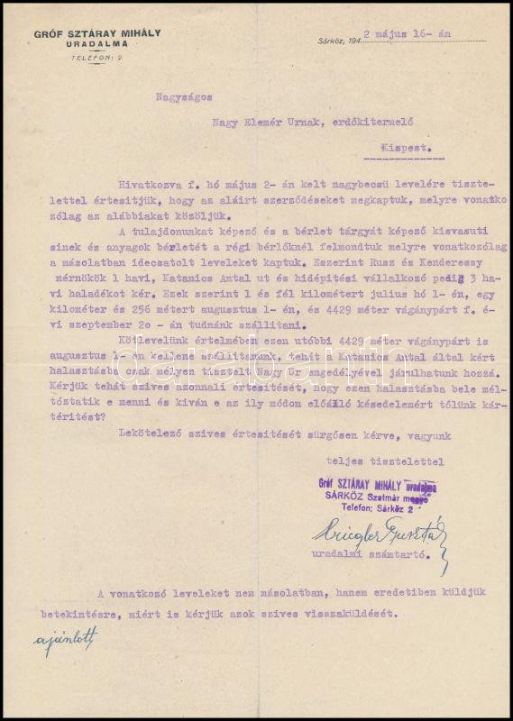 1942-43 Gróf Sztáray Mihály sárközi uradalmának levelezése Katanics Antal út- és hÃdépÃtÅ‘ mérnökkel, a budapest-szeged-beograd útvonal épÃtésvezetÅ‘jével, és e kapcsán Nagy Elemér fakitermelÅ‘ cégével, honvédségi érdekeltségű út épÃtésével kapcsolatban, 3 db, Katanics Antal, és az uradalom számtartójának aláÃrásaival.