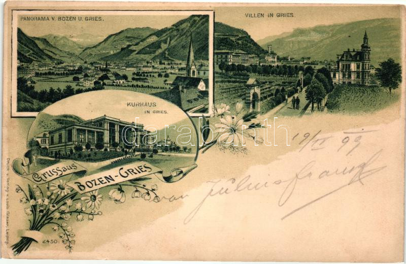 1899 Bolzano, Bozen, Gries; Panorama, kurhaus, villen / general view, spa, villas, floral, litho (EK)