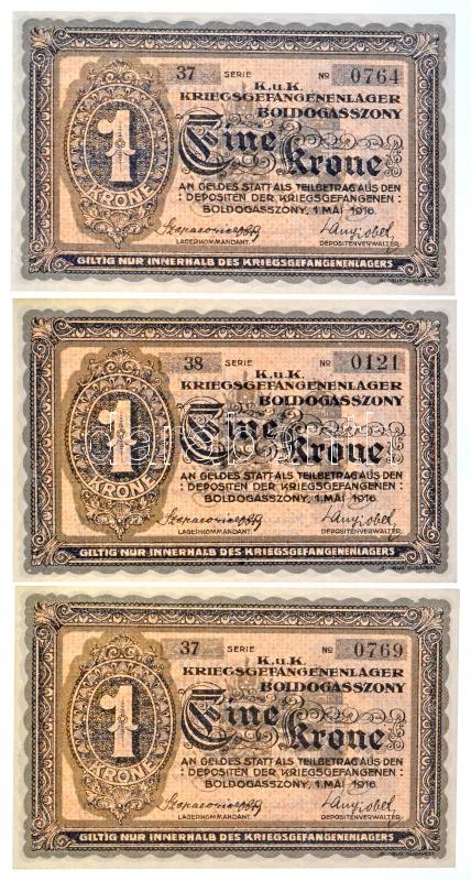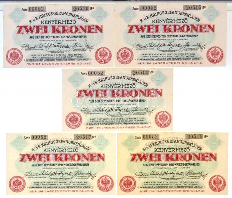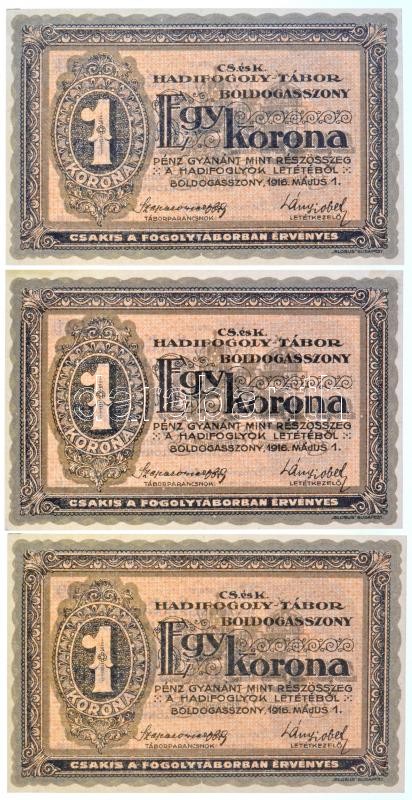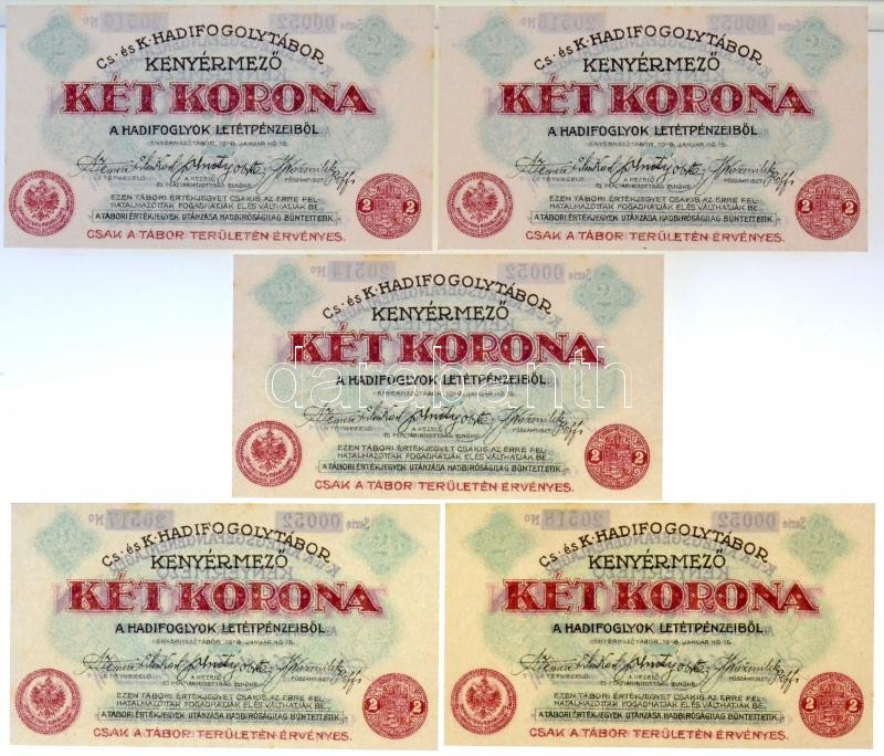 Boldogasszony / hadifogolytábor 1916. május 1. 1K arab sorozat és sorszámmal (3x) + Kenyérmező / Hadifogolytábor 1916. január 15. 2K arab sorozat- és sorszámmal (5x) sorszámkövetők T:I / Hungary / Boldogasszony / POW camp 1916. May 1. 1 Korona with arabic series and serial number (3x) + Kenyérmező / POW camp 1916. January 15. 2 Korona (5x) with arabic series and serial number, sequential serials C:UNC