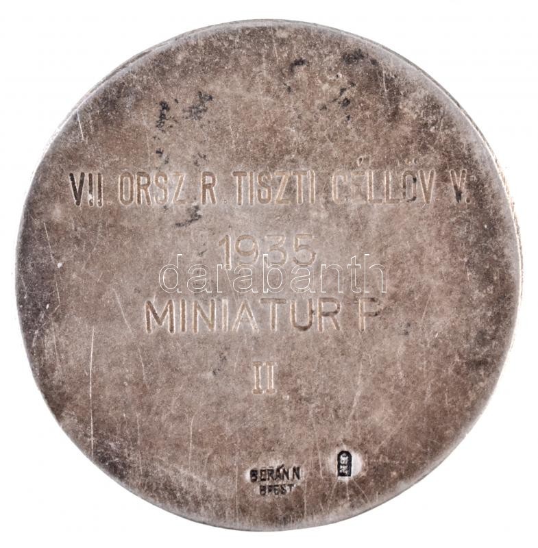/ Hungary 1935. "Rendőrtiszti Athletikai Club (Police Athletic Club) - Honos Tibi Patriae Spes / VII. Orsz. R.tiszti Céllöv. V. 1935 Miniatür P. II." silvered metal award medal with "BERÁN N BPEST" makers mark. Sign.: Lajos Berán (36mm) C:XF patina, silver plating worn