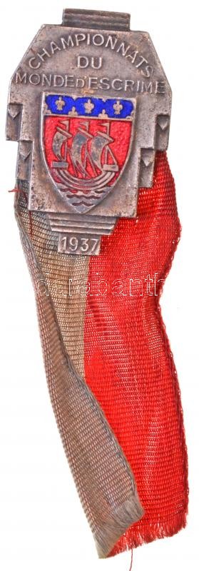 Franciaország 1937. "Championnats du Monde d'Escrime (Vívó világbajnokság)" részben zománcozott gomblyukjelvény, "L. AUBERT PAR S 14. RUE OBERKAMPF" gyártói jelzéssel, szalaggal, a szalagból nagyrészt kikopott a kék festék (22x33mm) T:1-,2 / France 1937. "Championnats du Monde d'Escrime (Fencing World Championship)" partially enamelled buttonhole badge, with "L. AUBERT PAR S 14. RUE OBERKAMPF" makers mark, with ribbon but with faded blue paint (22x33mm) C:AU,XF