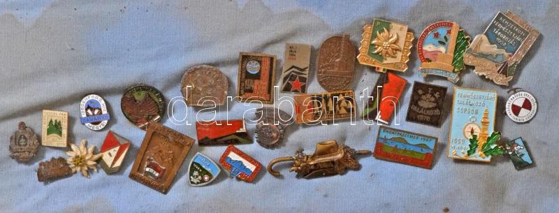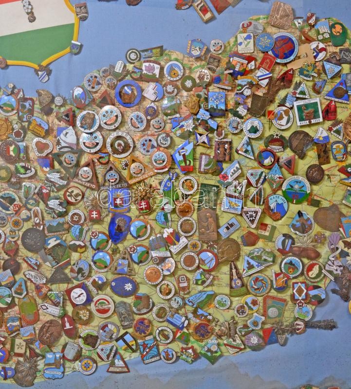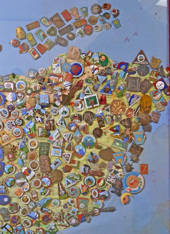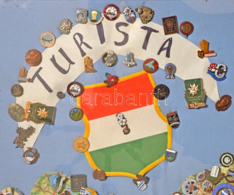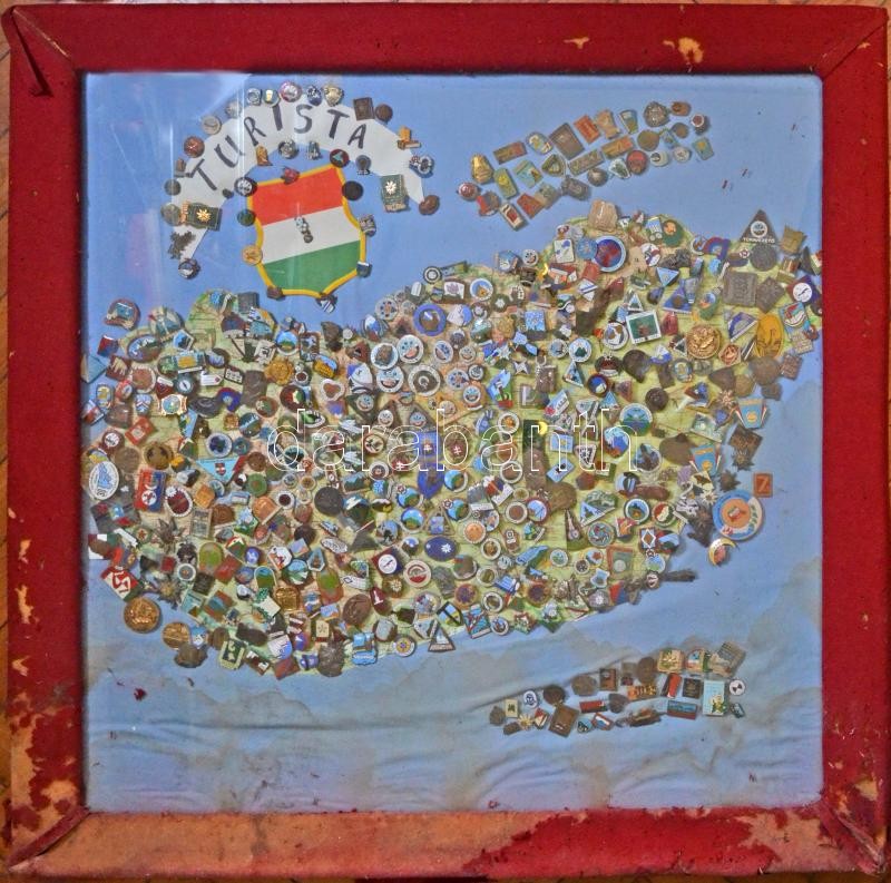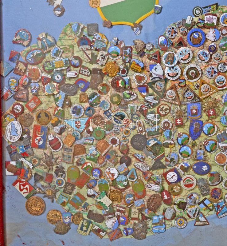 Magyar túrajelvény gyűjtemény, nagyméretű üvegezett fakeretben, Magyarország térképre rögzítve. Több száz darabos, közte sok különféle jelvénnyel és kitűzővel. A 20. század számos magyar természetjáró egyesületének és eseményének (Várbarátok Köre, Szövetkezeti Vörös Meteor SK, Spartacus Természetjárók) jelvénye megtalálható a gyűjteményben. A legtöbb darab zománcozott, nagyon szép tartásban. A fakeret filc borítása erősen sérült. T:1-,2 / Hungarian tour badge collection in a large wooden frame, fixed on a map of Hungary. Several hundred pieces of badges and pins with many different types. Many Hungarian hiker associations and tour events (Várbarátok Köre, Szövetkezeti Vörös Meteor SK, Spartacus Természetjárók) of the 20th century can be found in the collection. Most pieces are enamelled and in very nice condition. The felt cover of the wooden frame is damaged. C:AU,XF