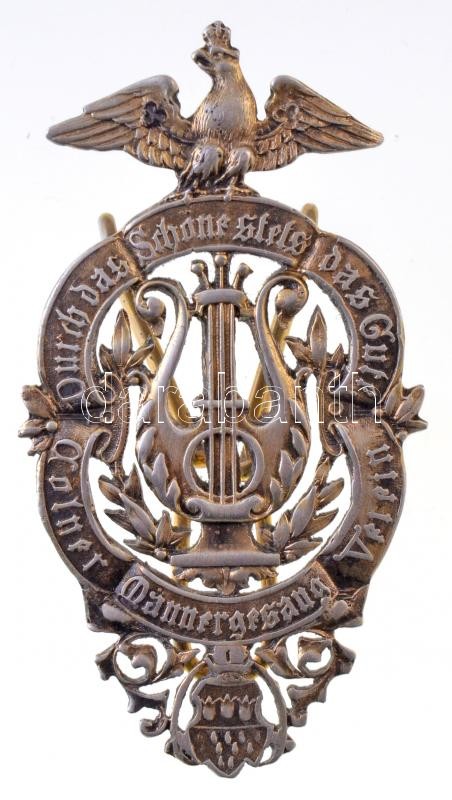 Német Birodalom / Köln ~1900. "Kölni Férfi Énekes Egyesület" ezüstözött fém jelvény (56x30mm) T:2 nem eredeti tűvel / German Empire / Cologne ~1900. "Cologne Men's Singing Group" silver plated metal badge (56x30mm) C:XF not original pin