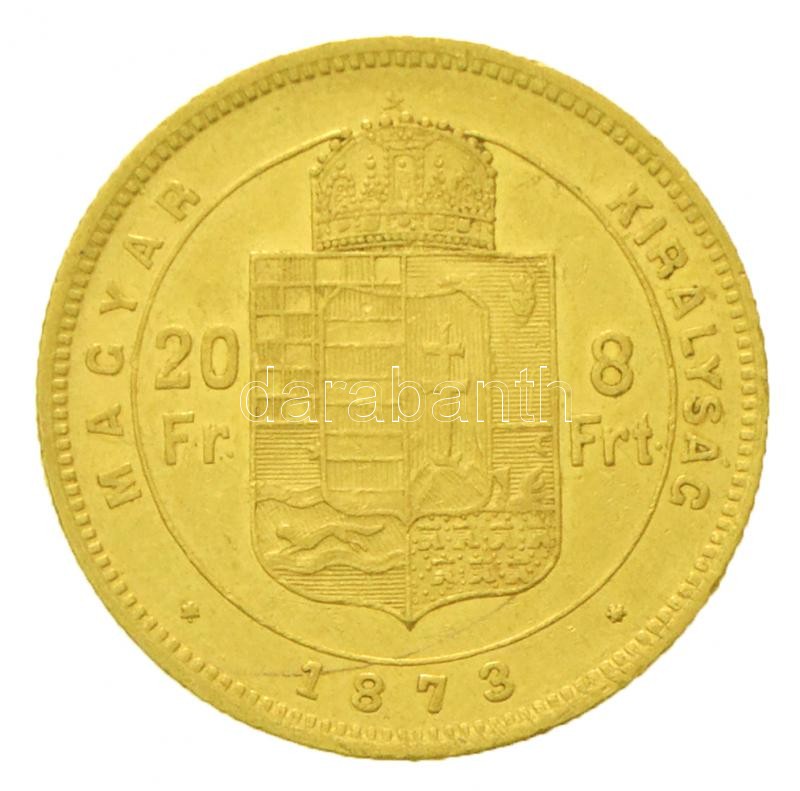 1873KB 8Ft/20Fr Au "Ferenc József / Középcímer" Körmöcbánya ... https://www.darabanth.com/en/28-Major-auction/28.1/Numismatics/Gold-coins-and-commemorative-medallions~11290/1873KB-8Ft20Fr-Au-Ferenc-Jozsef-Kozepcimer-Kormocbanya-644g0900-T2-kis-ph-Hunga~II1685110