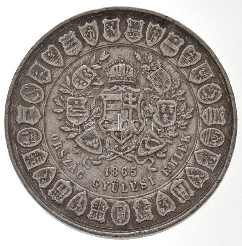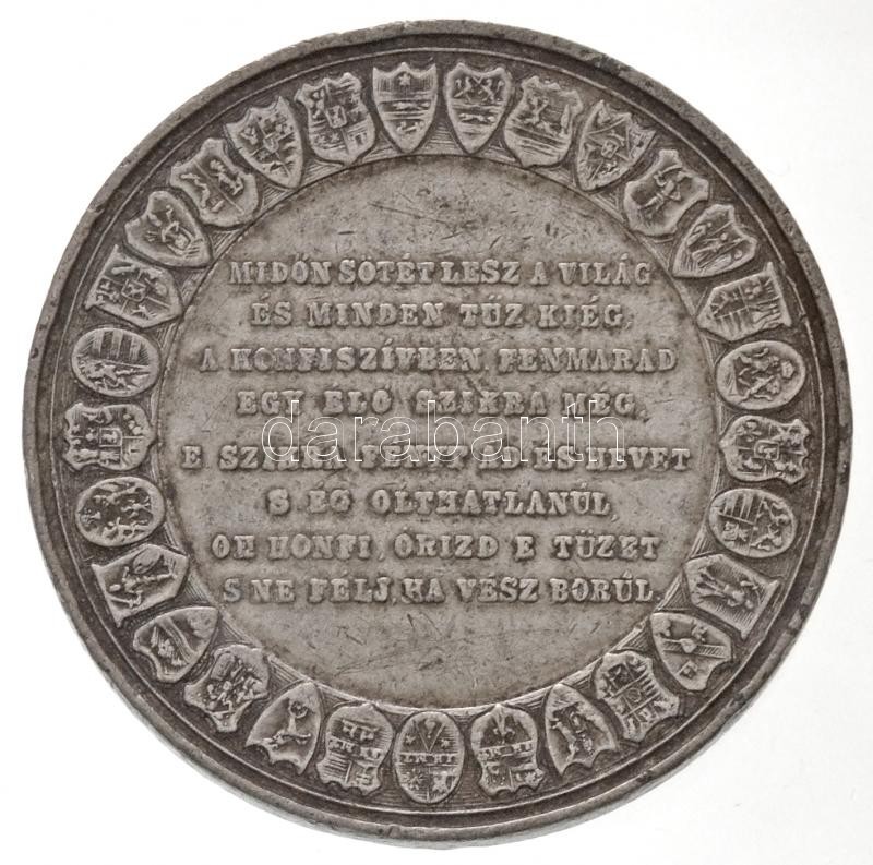 1865. "Országgyűlési Emlék" Sn emlékérem, "FM" gyártói jelzéssel "1865 ORSZÁG GYŰLÉSI EMLÉK / MIDŐN SÖTÉT LESZ A VILÁG - ÉS MINDEN TŰZ KIÉG - A HONFISZÍVBEN FENMARAD EGY ÉLŐ SZIKRA MÉG. - E SZIKRA FÉNYT AD ÉS HEVET - S ÉG OLTHATATLANUL - OH HONFI, ŐRIZD E TÜZET - S NE FÉLJ, HA VÉSZ BORUL." (34,19g/50mm) T:2,2- ph. / Hungary 1865. "Parliamentary Diet Commemorative Medallion" Sn commemorative medallion with "FM" maker's mark (34,19g/50mm) C:XF,VF edge error