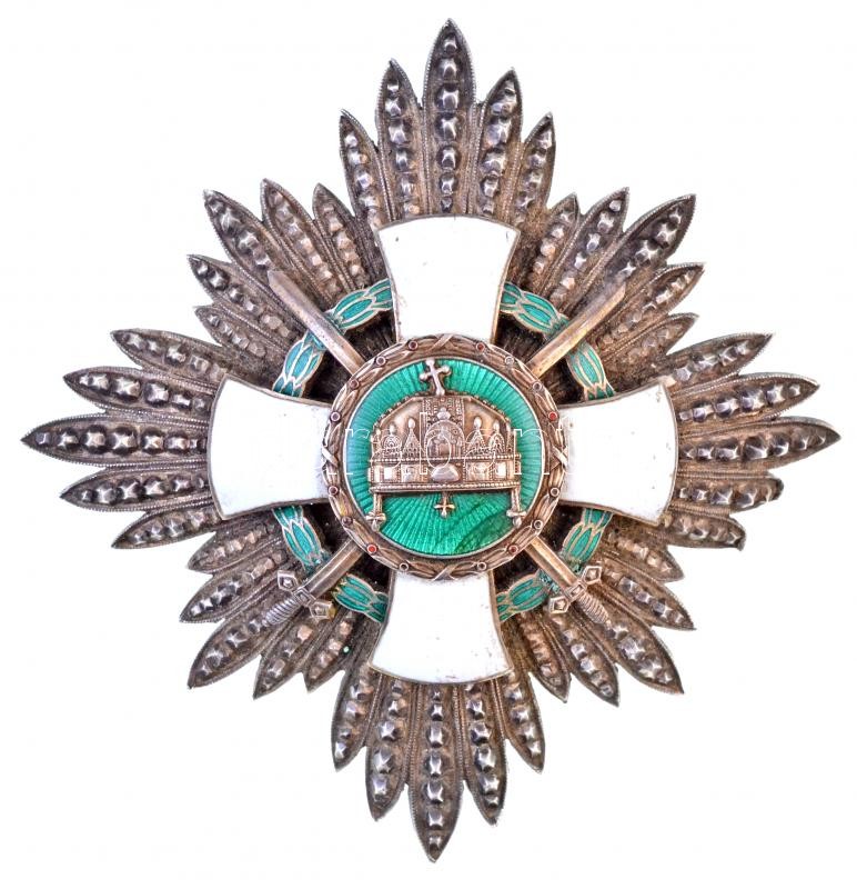 1943. "A Magyar Szent Korona-rend középkeresztjének csillaga hadidíszítménnyel és kardokkal" zománcozott, jelzetlen Ag csillag függőleges tűvel (80mm) T:2 kis zománchiány, medalion közepén kis zománchiba, csillag ágának végén kis elhajlás /