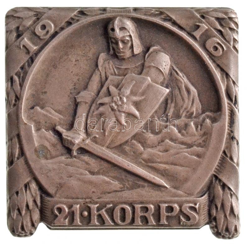 Osztrák-Magyar Monarchia 1916. "21. Hadtest" ezüstözött tombak sapkajelvény. "ENTW LTN H. BERTLI AUSGEF ATEL GUBSCHNER WIEN VII/2 (TERVEZTE H. BERTLI HADNAGY. KÉSZÍTETTE GUBSCHNER, BÉCS VII/2)" (30x30mm) T:2