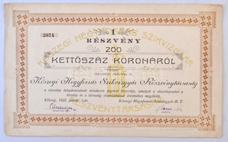 / Hungary / Kőszeg 1922. "Kőszegi Hegyforrás Szikvizgyár Részvénytársaság" share about 200 Korona, with handwritten signatures C:F