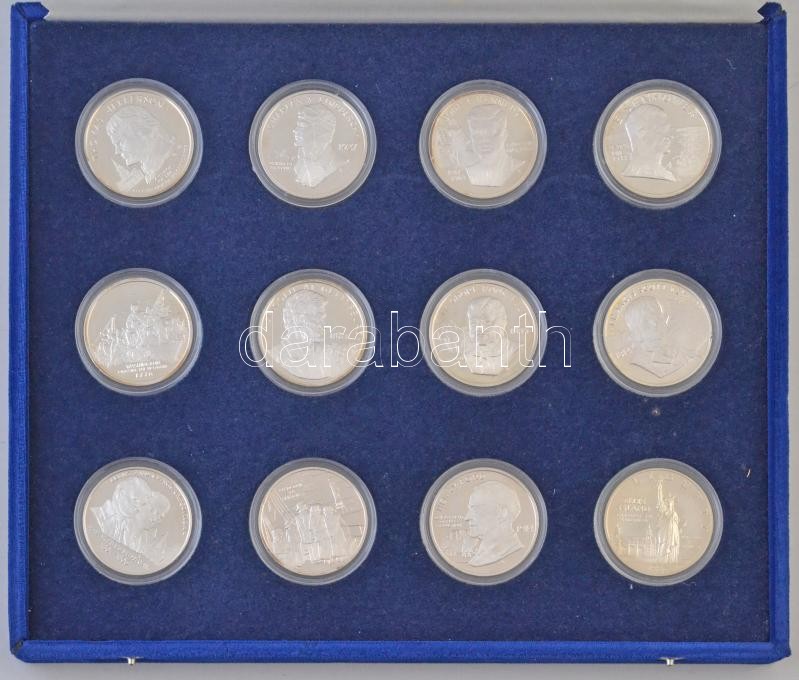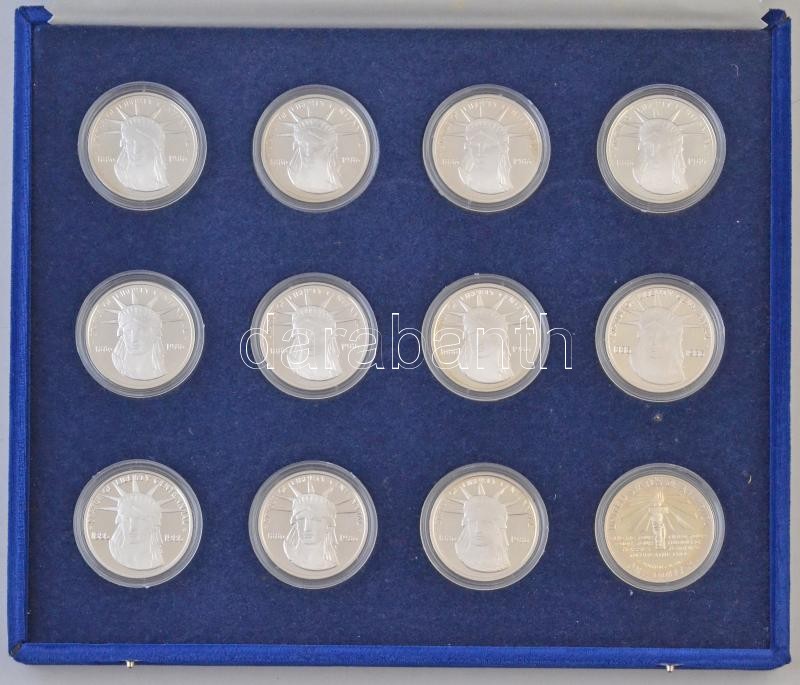 Amerikai Egyesült Államok 1986. "100 éves a Szabadságszobor" emlékérem szett, 12xklf: "Lincoln", "John F. Kennedy", "Washington crossing the Delaware", "Eisenhower", "Thomas Jefferson", "Francis Scott Key", "Charles Lindbergh", "Theodore Roosevelt", "Lewis and Clark", "Henry Ford", "Welcome to America" valamint 1986. 1$ Ag "100 éves a Szabadság szobor". Az érmék eredeti papír- és bársonydobozban tanúsítvánnyal és német nyelvű tájékoztató füzettel (érmenként: 26,73g/0.900/38,1mm) T:PP kis patina / USA 1986. "The Statue of Liberty Centennial Collection" commemorative medal set 12xdiff: "Lincoln", "John F. Kennedy", "Washington crossing the Delaware", "Eisenhower", "Thomas Jefferson", "Francis Scott Key", "Charles Lindbergh", "Theodore Roosevelt", "Lewis and Clark", "Henry Ford", "Welcome to America" and 1986. 1 Dollar Ag "Liberty Statue centennial". The medals in original paper and velvet box with certificate and German language Information Booklet (26,73g/0.900/38,1mm) C:PP small patina