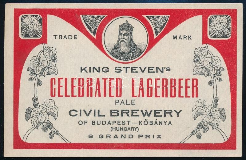 Description: cca 1920 Szent István láger, exportra készült sörcímke, Polgári Serfőzde, 7,5x12 cm / Civil Brewery, King Steven's Celebrated lagerbeer, export beer label 7,5x12 cm
