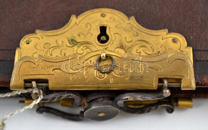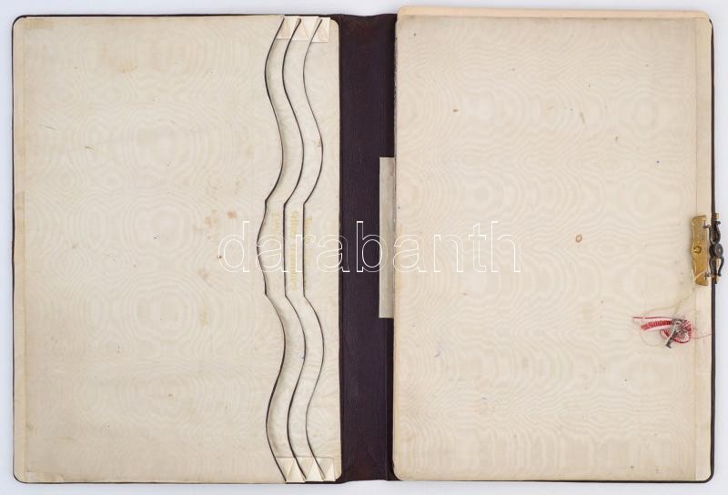 Description: XIX. sz. író és levelező mappa, iratrendező. Dombornyomott bőr, hímzett virág díszítéssel, selyem béléssel, zárható réz csattal, hozzávaló kulccsal. Nagyon szép, megkímélt állapotban / XIX. sz. vintage letter and paper mappe. Leather with embroided ornament, copper lock with key. In nice condition. 40x30 cm