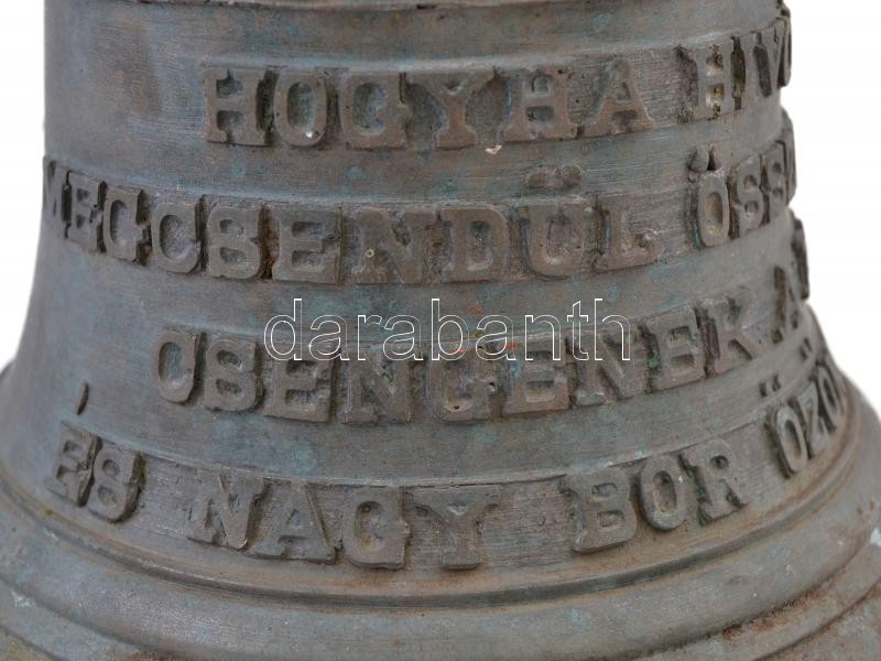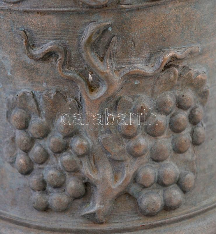 XX. sz. eleje: Szőlőgazdaság, pincészet régi bronz harangja. Szőlőfürt díszítéssel és feliratozva. "Hogyha hívó hangod megcsendül, összesereglünk, csengenek a poharak és nagy bor özönbe úszunk". A haranghoz falra szerelhető kovácsoltvas harang-állvány. Tiszta, erős hangú. A harang mérete M:26 cm, d:21 cm / Vintage bell of a vinery. Bronze with bell stand for the vall.