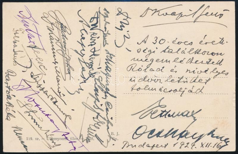 1929 Bartók Béla zeneszerző és volt osztálytársainak (Weisz Henrik, Alapy Gábor, stb.) aláírásai 30 éves érettségi találkozóról küldött levelezőlapon