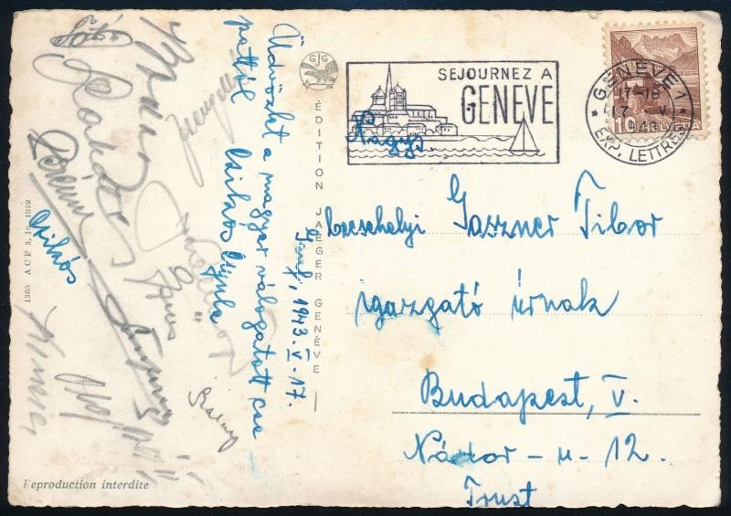Description: 1943 Svájc-Magyarország válogatott mérkőzés, a magyar labdarúgó válogatott által aláírt képeslap (Csikós Gyula, Kincses, Zsengellér és mások) / 1943 Switzerland-Hungary autograph signed postcard of the Hungarian national football team.