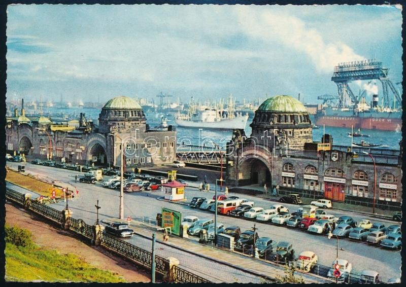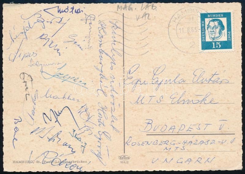 Description: 1965 A magyar válogatott labdarúgócsapat tagjai által aláírt képeslap Hamburgból. (Rákosi, Sárosi, Sebes, Mátrai, Géczi, ...) / Autograph signed postcard of Hungarian national football team.