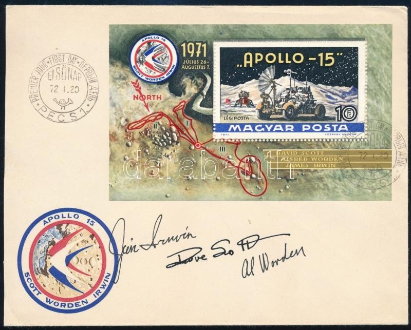 Description: 1971 James Irwin (1930-1991), David Scott (1932- ) és Alfred Worden (1932- ) amerikai űrhajósok aláírásai "Apollo 15" FDC-n /