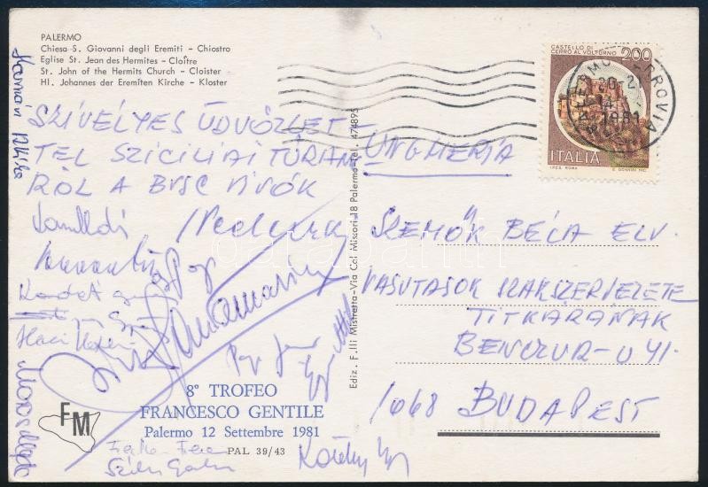 1981 A BVSC vívóinak aláírásai a Vasutasok Szakszervezete titkárának Szicíliából küldött levelezőlapon