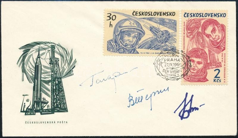 Jurij Alekszejevics Gagarin (1934-1968), Valentyina Tyereskova (1937- ) és Valerij Bikovszkij (1934- ) szovjet űrhajósok aláírásai emlékborítékon /