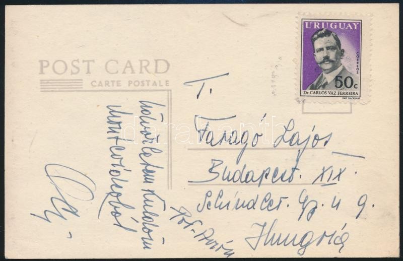 Puskás Ferenc (1927-2006) üdvözlő sorai és aláírása Montevideóból Faragó Lajos (1932- ) labdarúgó részére küldött levelezőlapon