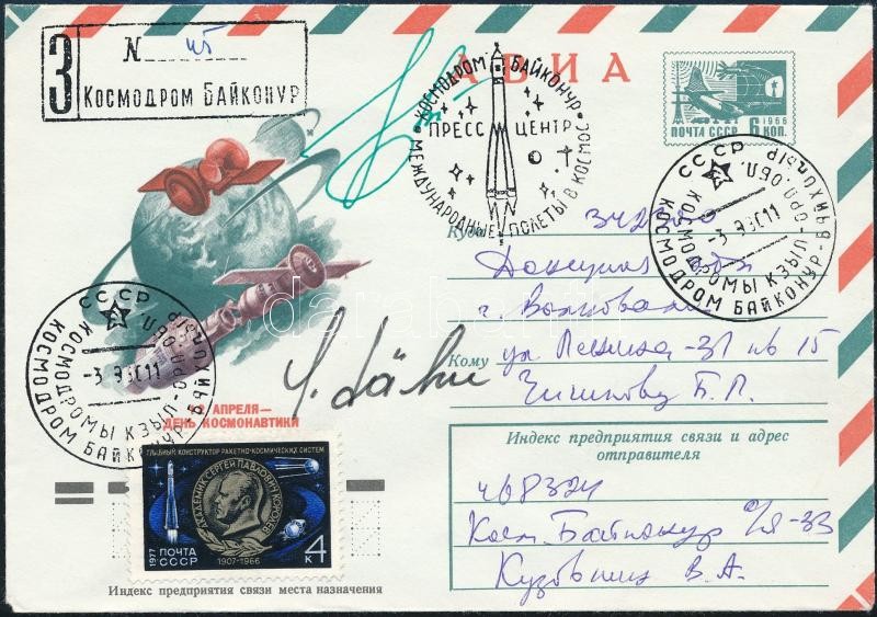 Description: Valerij Bikovszkij (1934- ) szovjet és Sigmund Jähn (1937- ) német űrhajósok aláírásai emlékborítékon /