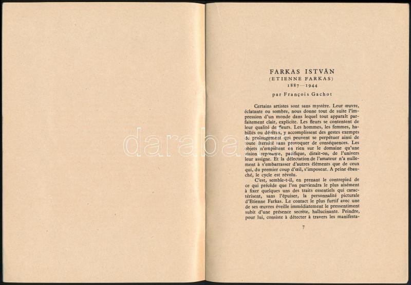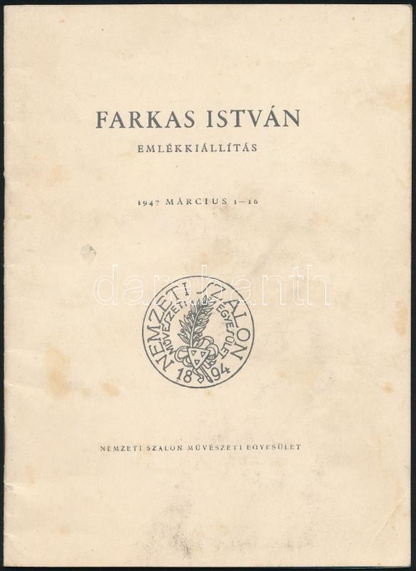 Farkas István (1887-1944) Emlékkiállítás. 1947. március 1-16. Bp., 1947, Nemzeti Szalon Művészeti Egyesület, (Athenaeum-ny.), 31 p. Kiadói tűzött papírkötés, francia és magyar nyelven. Az Auschwitzban meghalt festőművész emlékkiállításának katalógusa. Halála után az első kiállítás, fekete-fehér fotókkal illusztrálva, a képek leírásaival.