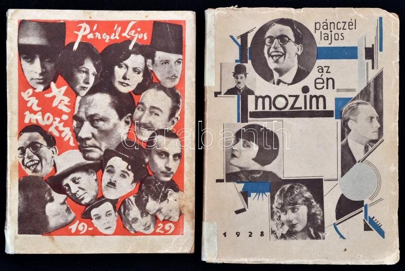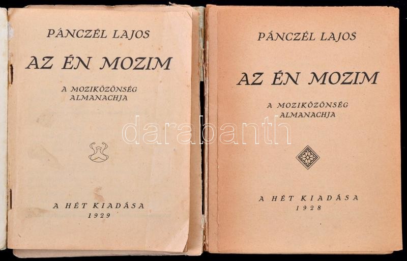 1928-1929 Pánczél Lajos: Az én mozim. A moziközönség almanachja. Két évfolyam. Teljes. A borítók Madaras László és Byssz Róbert munkái. Bp., Hét, 187+4+181+3 p. Papírkötés. Az 1928-as szám kissé viseltes állapotban,a kötés gerince sérült, javított, a kötése laza, a címlap kijár. Az 1929-as szám borítója foltos, a gerincen kis javítással.