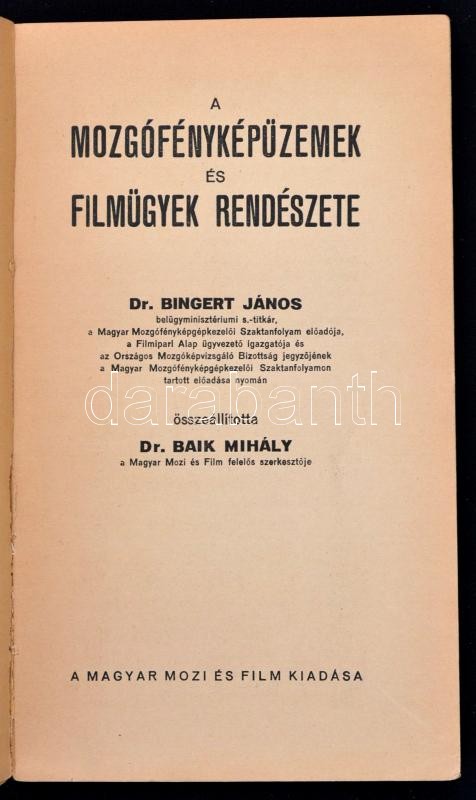 Dr. Bingert János: A mozgófényképüzemek és filmügyek rendészete. Dr. Bingert János elÅ‘adása nyomán összeállÃtotta Dr. Baik Mihály. Bp.,(1928), Magyar Mozi és Film, 112 p. Kiadói papÃrkötés, a gerincen kis javÃtással, az elsÅ‘ lap kijár, ezt leszámÃtva jó állapotban, korabeli reklámokkal. Ritka!