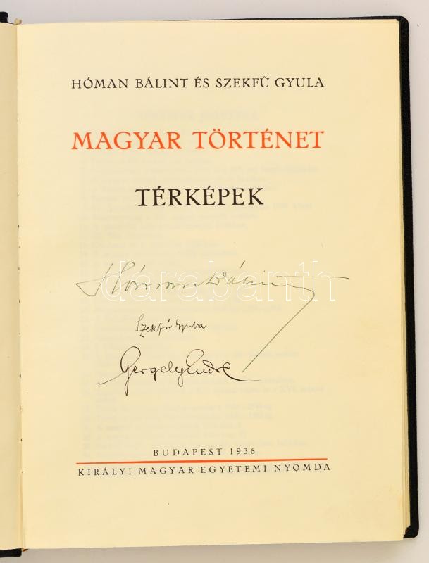 Description: Hóman Bálint és Szekfű Gyula: Magyar történet térképek. Bp., 1936. Kir. Magyar Egyetemi Nyomda. Hóman Bálint, Szekfű Gyula és a térképeket készítő Gegely Endre saját kezű aláírásával. 6p.+ 51t. Kiadói aranyozott egészvászon kötésben, hibátlan állapotban. Védőtokkal. Ritka!