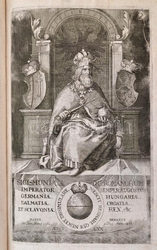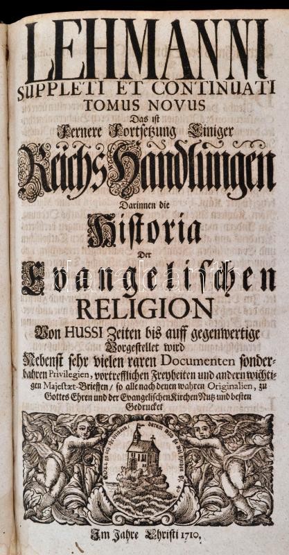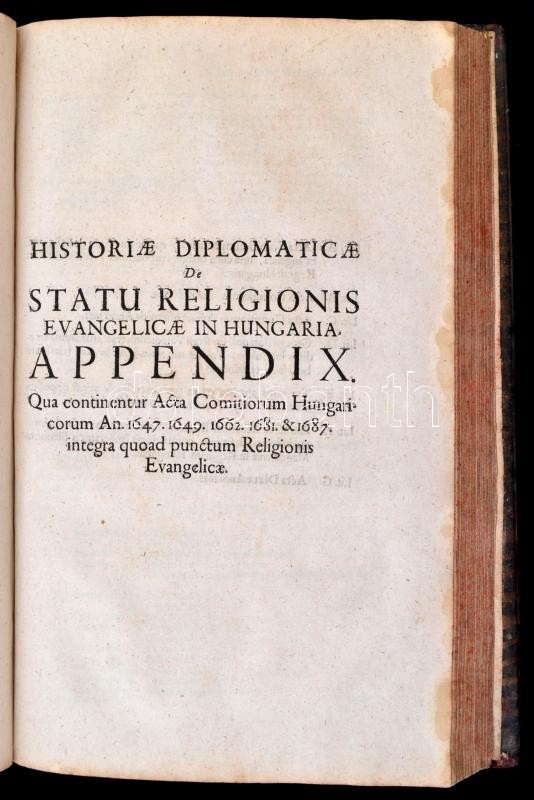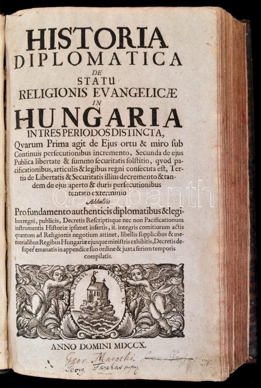 [Okolicsányi Pál]: Historia Diplomatica de Statu Religionis Evangelicae in Hungaria in tres periodos dictincta,... Hozzákötve: +Brevissimum Compendium Principatus Transylvanici Historiae ab Anno MDXXVI. usque ad Annum MDCCIII. Cum variis documentis et diplomatibus.+Historia Diplomaticae de Statu Religionis Evangelicae in Hungaria, Appendix. Qua continentur Acta Comitiorum Hungaricorum An.1647.1649.1662.1681.&1687. integra quoad punctum Religionis Evangggelicae. [Frankfurt am Main], 1710, ny.n., 16+22 t. (rézmetszet) +150+1+56+250 p. Korabeli bordázott gerincű egészbőr-kötésben, restaurált gerinccel és borítóval, de belül jó állapotban, latin nyelven. Az elülső előzéklapon és a címlapon korabeli bejegyzésekkel, névbejegyzésekkel. Szedett könyv- és záródíszekkel, metszetekkel. A metszetek német-római császárokat, illetve a reformáció néhány jelentős alakját ábrázolják. 1704-ben I. Lipót béketárgyalásokat kezdett a II. Rákóczi Ferenc vezette magyarokkal, és a evangélikus felkelőknek is kedvező ajánlatot tett sérelmeik orvoslására. A munkát abból a célból állították össze, hogy később az alkudozásoknál alapul szolgáljon, de kiadását nem tervezték. A szerző tudta nélkül külföldre juttatták és megjelentették. Okolicsányi Pál (? , 1650 körül - ? , 1715 - 21 között) ügyvéd, Turóc vármegyei birtokos nemes. 1690-es években II. Rákóczi Ferenc jogtanácsosa. 1701-ben ellene is elfogató parancsot adtak ki ellene. Később kegyelmet kapott és a bécsi kormányzat hívévé szegődött, s a kurucokkal folytatott béketárgyalásokon (selmeci (1704),nagyszombati (1705, 1706)) a császár megbízottainak egyike. Későbbi országgyűlésen (1714-1715) az evangélikusok részéről a protestáns érdekek egyik fő védelmezője. Maróthi György (1715-1744) matematikus, pedagógus, a Debreceni Református Kollégium professzora, zeneszerző, magyar zeneelmélet úttörőjének névbejegyzésével, dátumozva. (1740.) Maróthi György maga is jelentős könyvtárral rendelkezett. / In Latin, leather binding, restored, in good condition.
