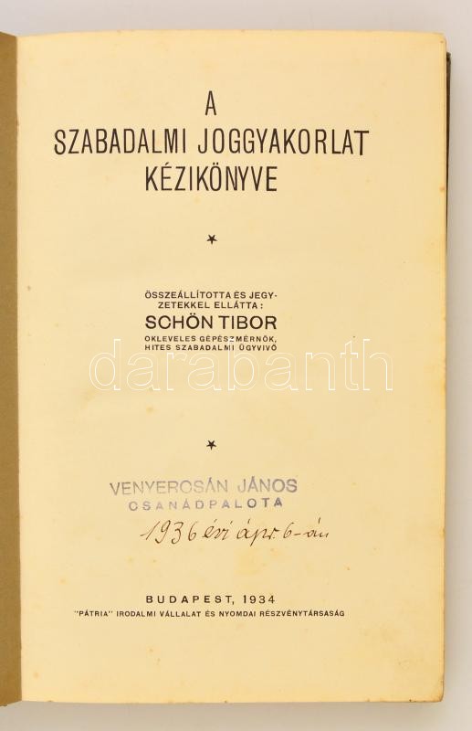 Schön Tibor: A szabadalmi joggyakorlat kézikönyve. Bp., 1934, Pátria. ... https://www.darabanth.com/en/28-Major-auction/28.1/Other-collectibles/Books-Law~11198/Schon-Tibor-A-szabadalmi-joggyakorlat-kezikonyve-Bp-1934-Patria-Kiadoi-egeszvaszon-kot~II1617419